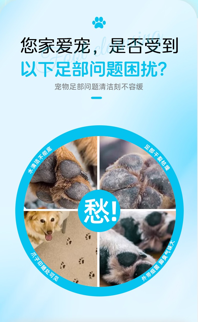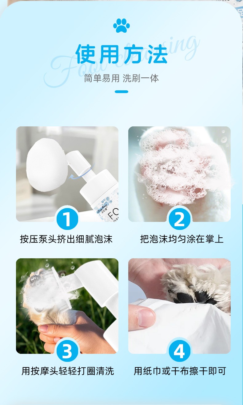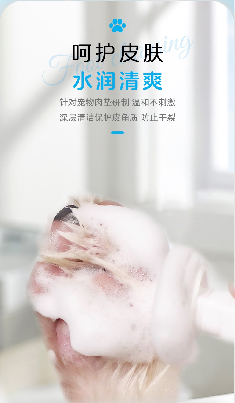 本品用于宠物足部日常的清洁和护理,具有滋润足部,防止足底干燥开裂,清除宠物外出带来的污垢和灰尘的作用。