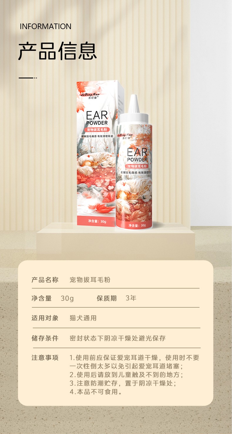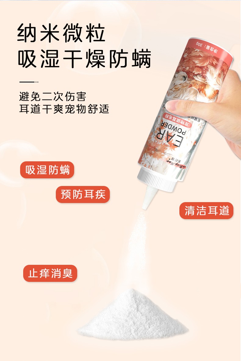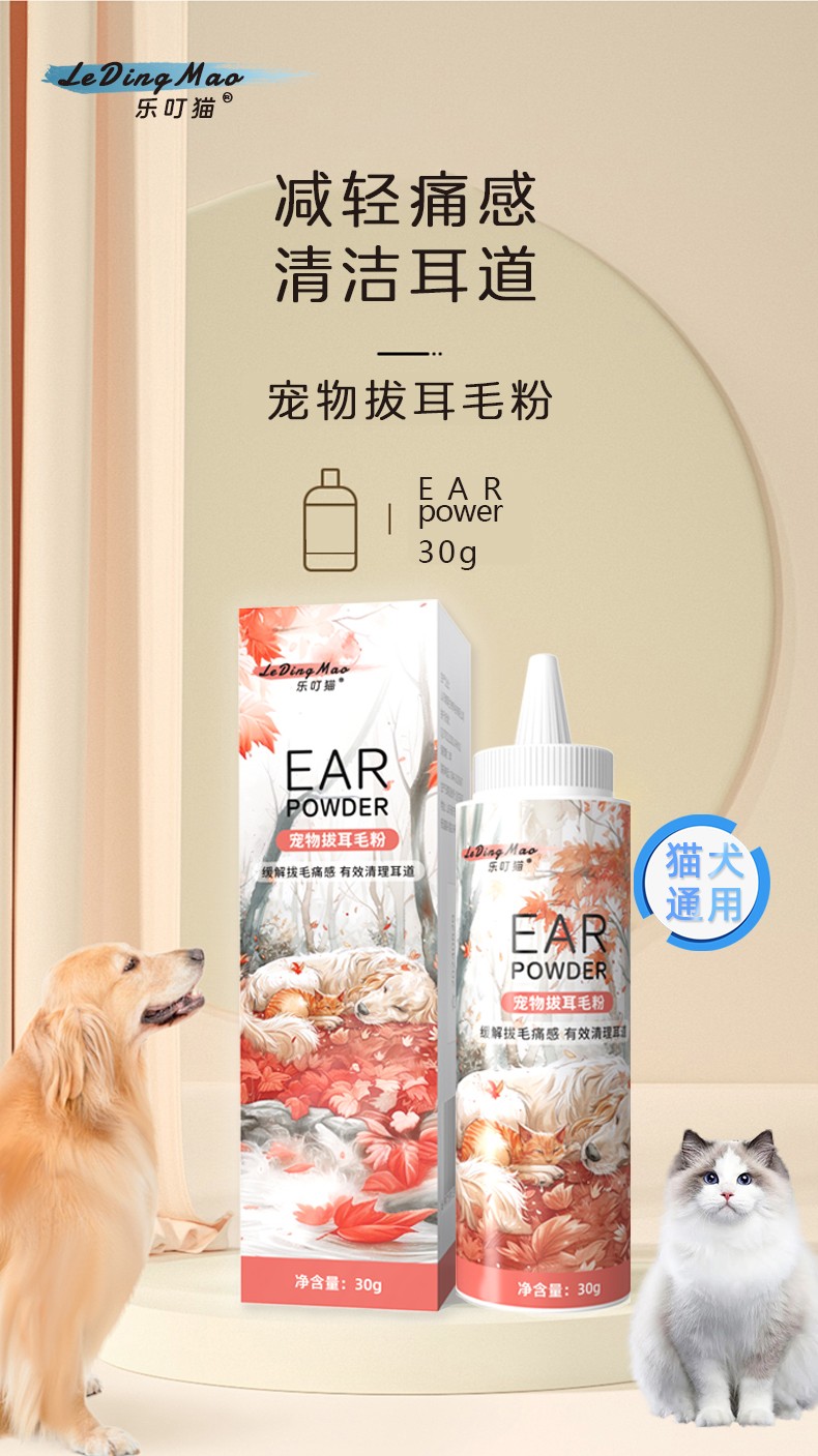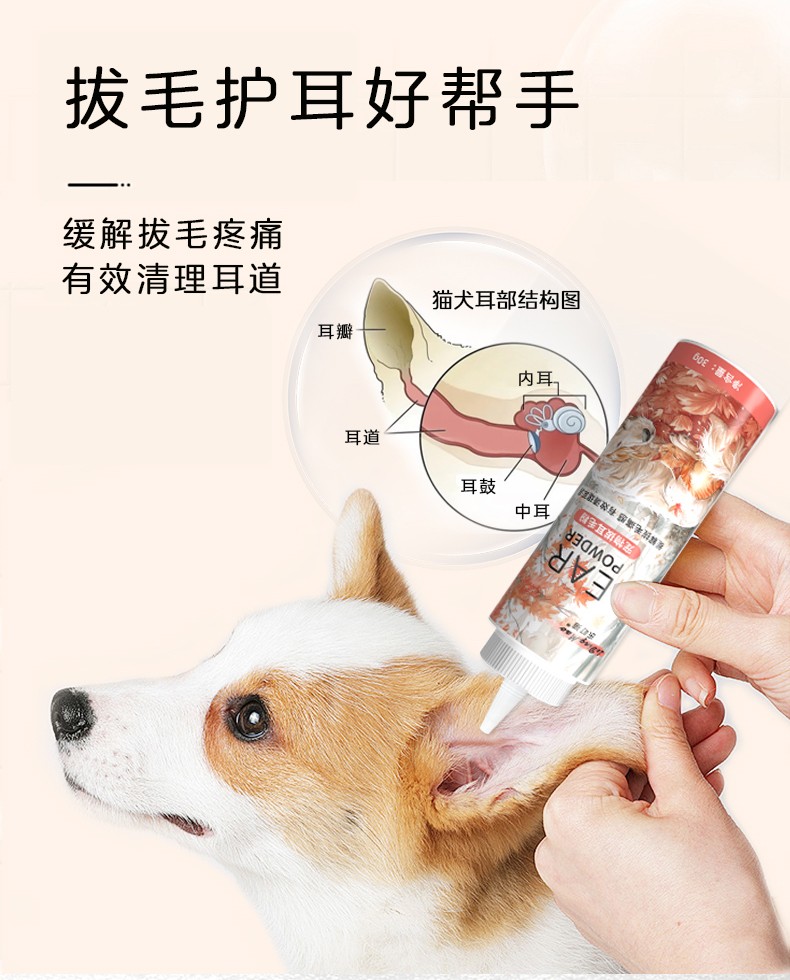 本品为猫犬通用拔毛耳粉。具有减轻拔毛痛感,有效清理耳道,预防感染的作用。