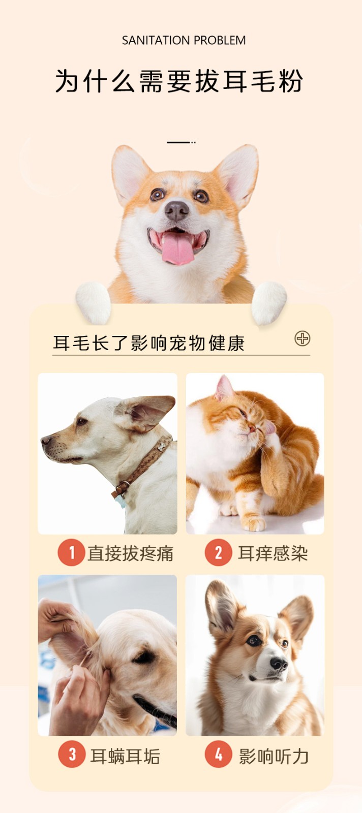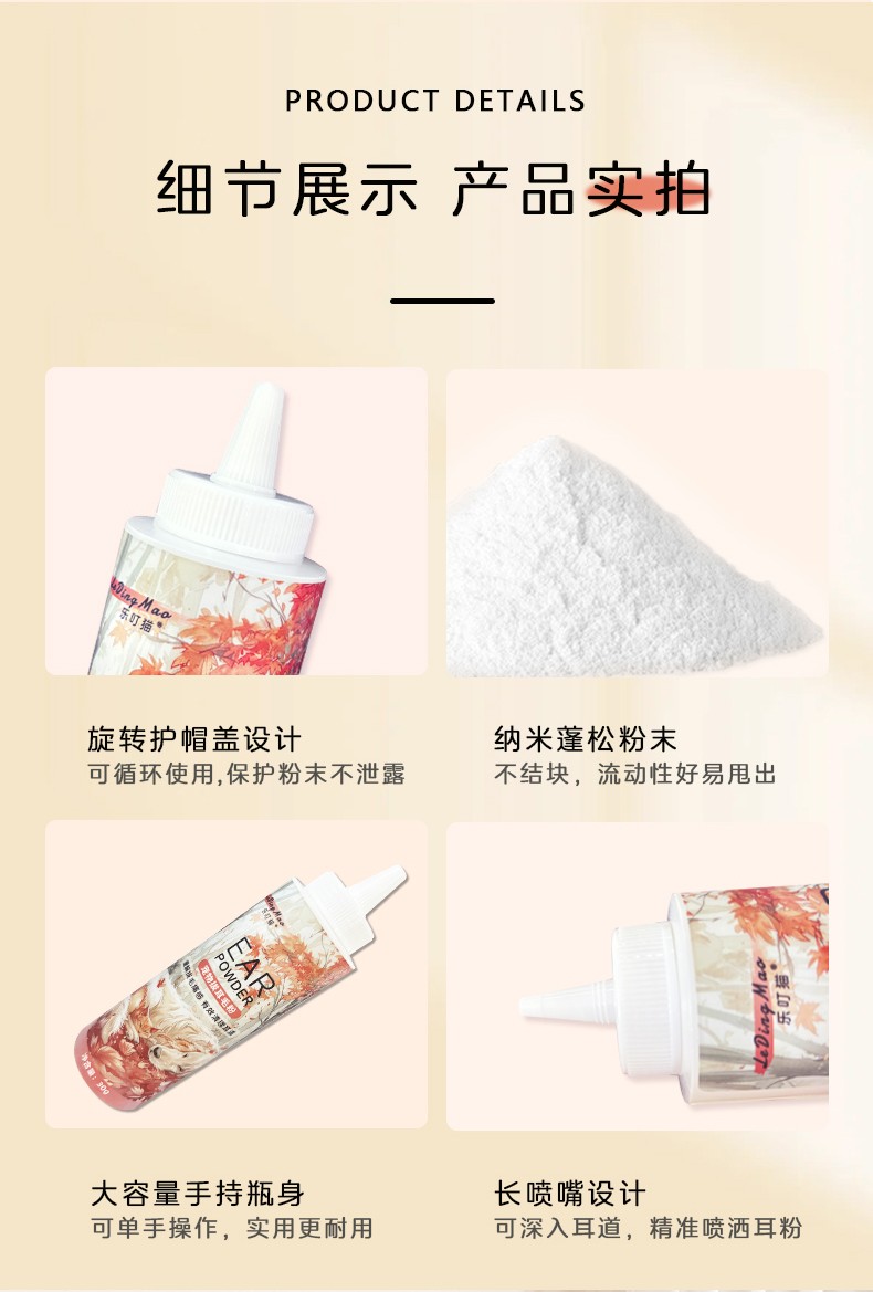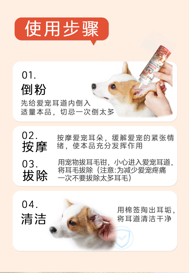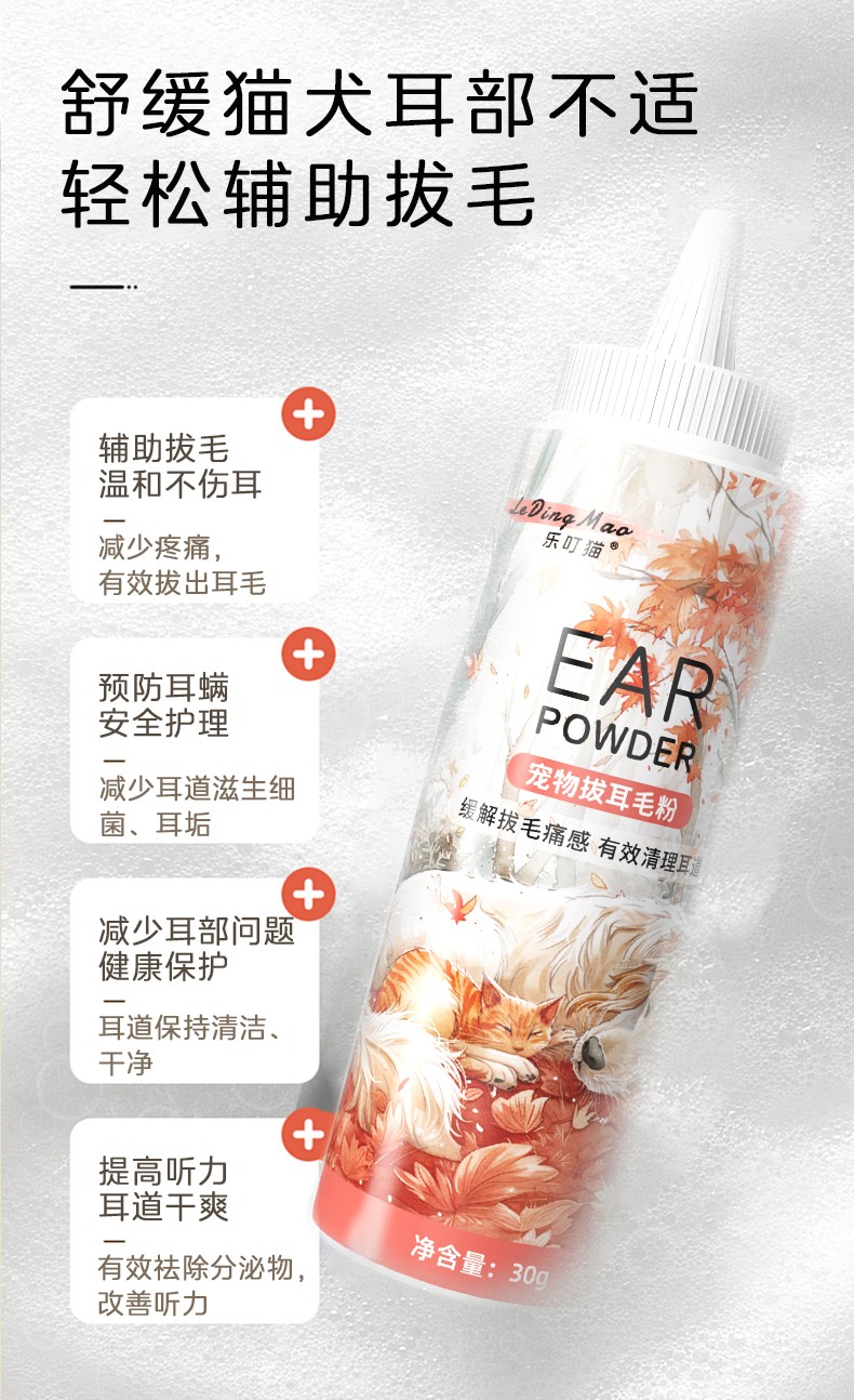 本品为猫犬通用拔毛耳粉。具有减轻拔毛痛感,有效清理耳道,预防感染的作用。
