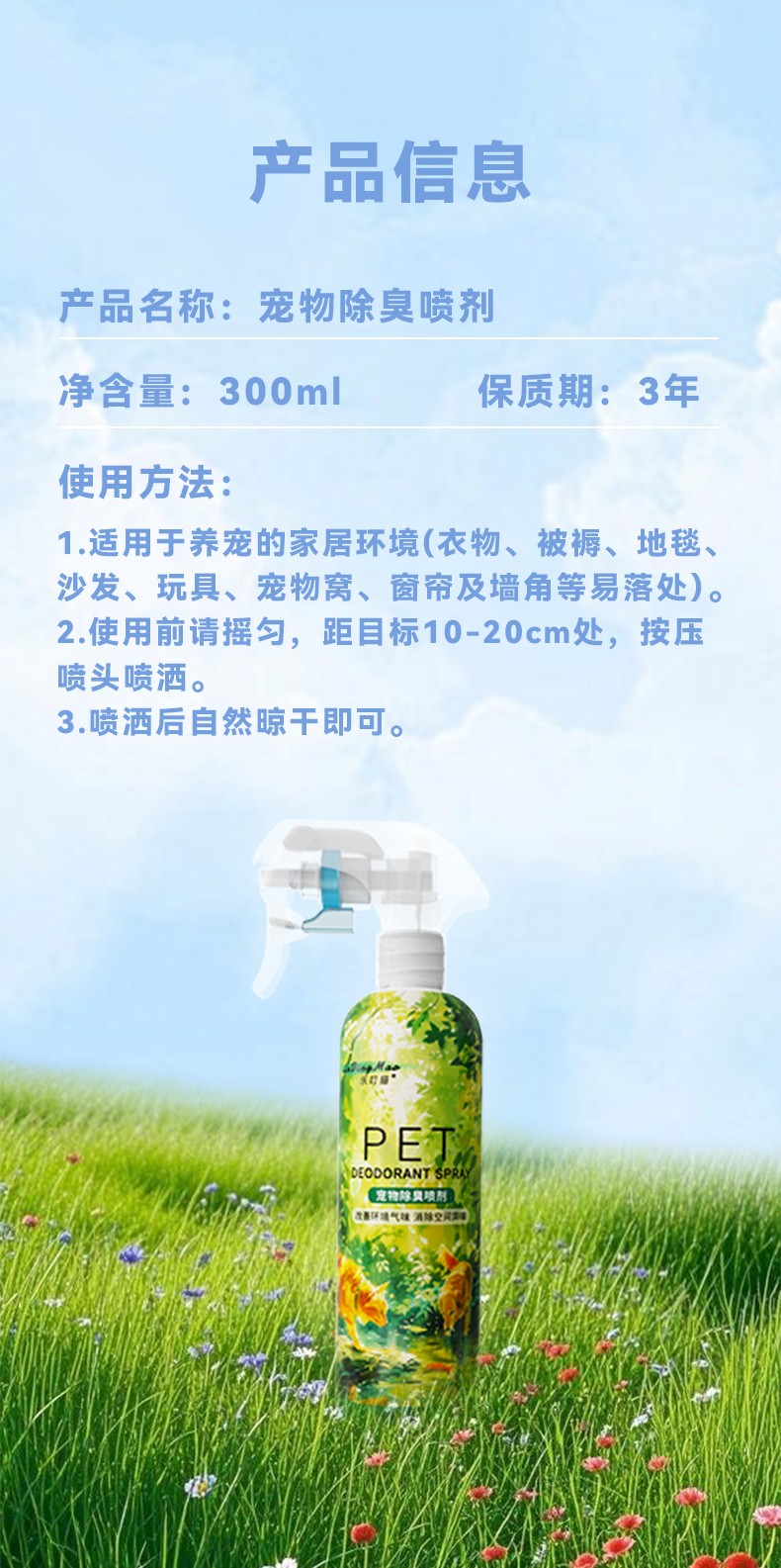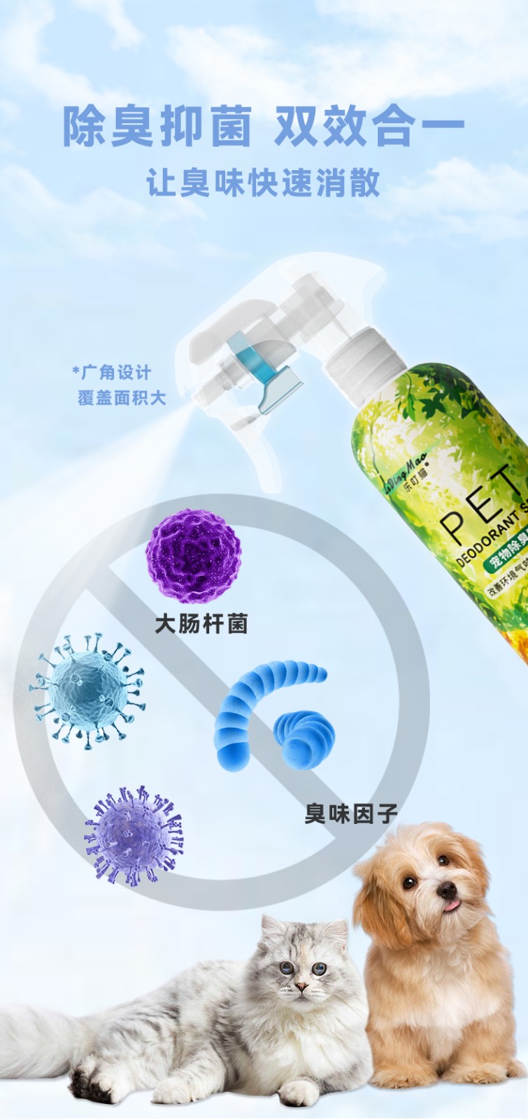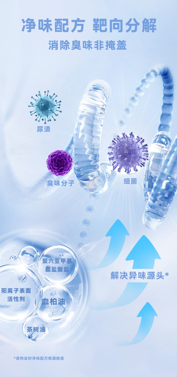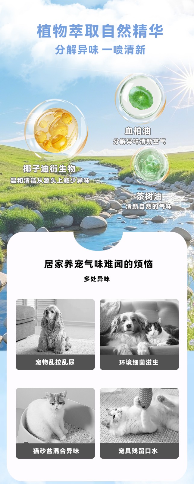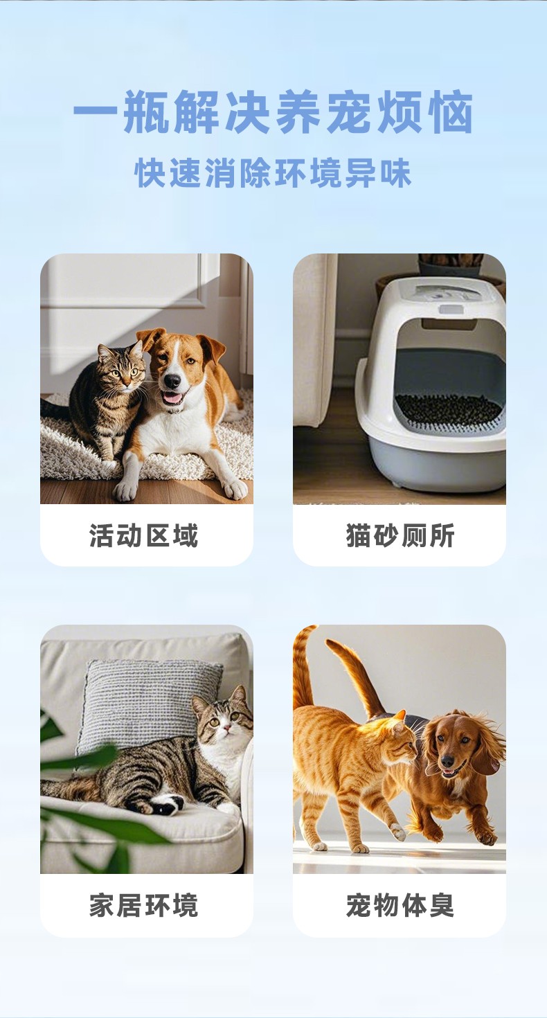 本品用于养宠家居环境气味改善,消除宠物陪伴带来的空间异味。