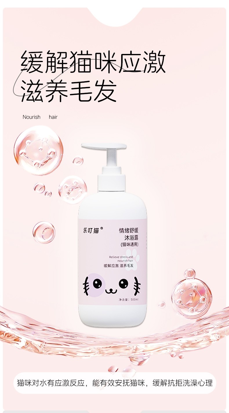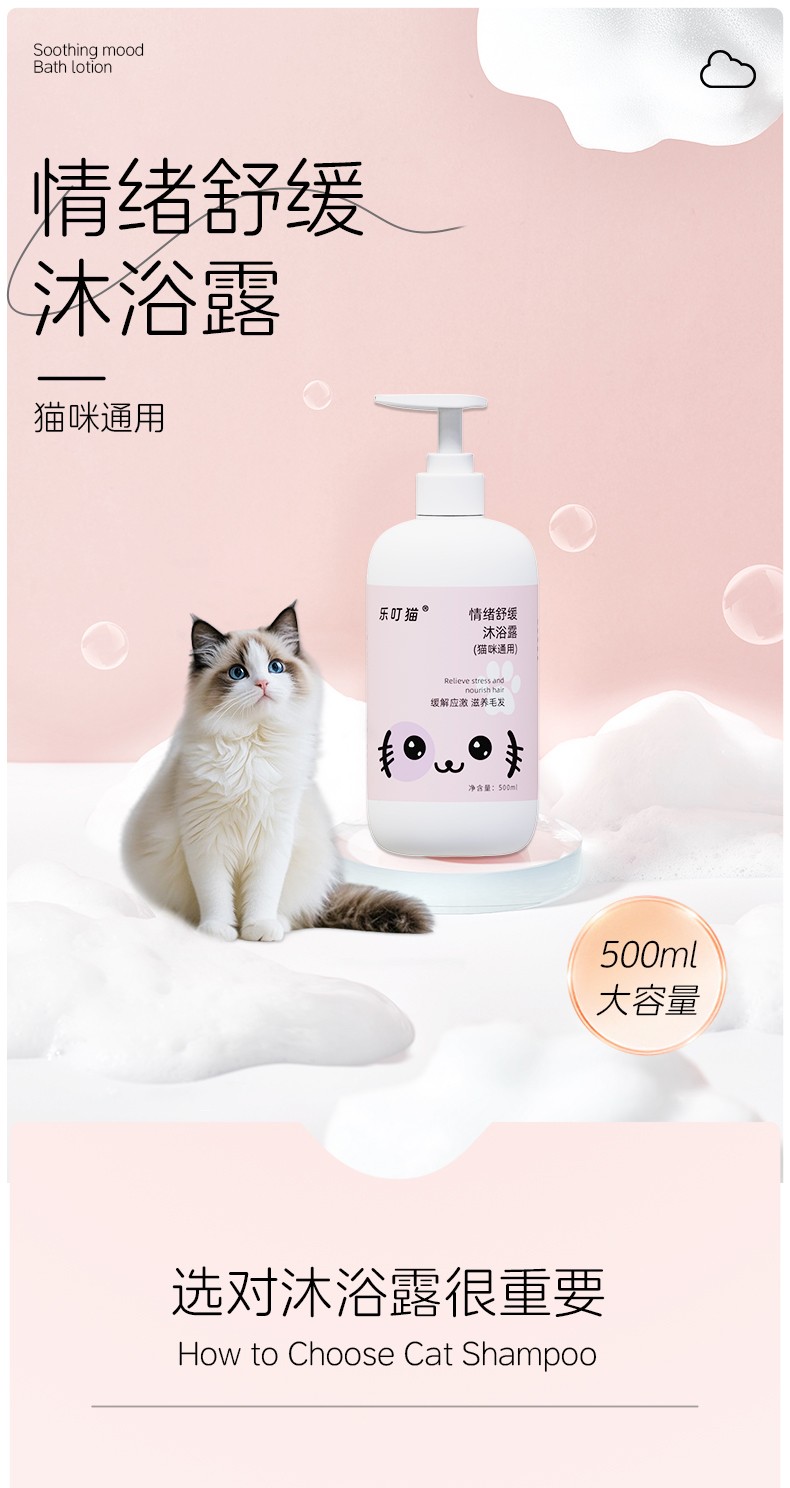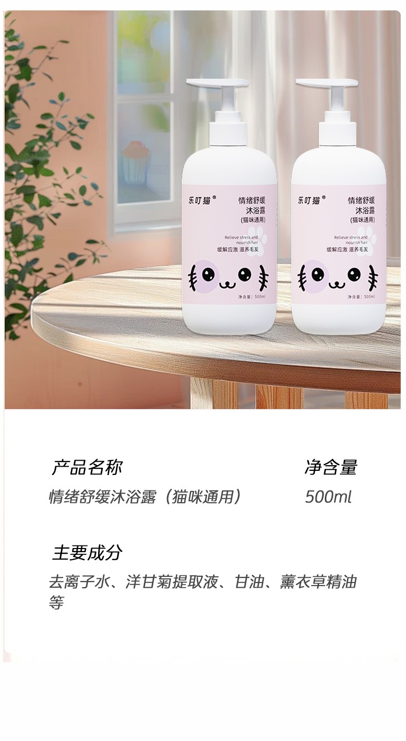 乐叮猫猫咪情绪舒缓沐浴露 (500ml):天然洋甘菊薰衣草精粹,舒缓焦虑情绪 + 椰油甘油滋养,柔顺亮毛!APG植物无泪配方,洗澡安心更顺滑。