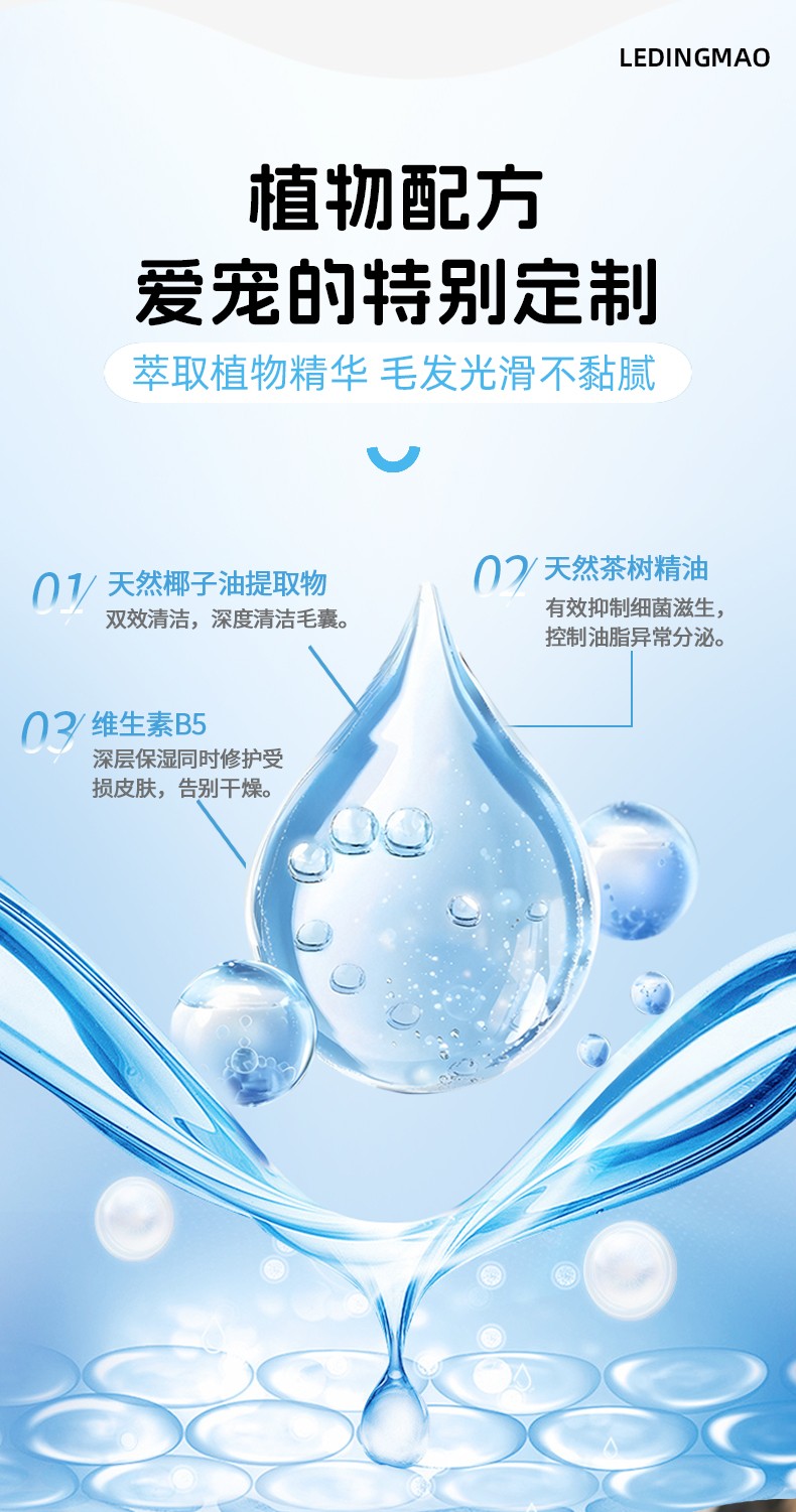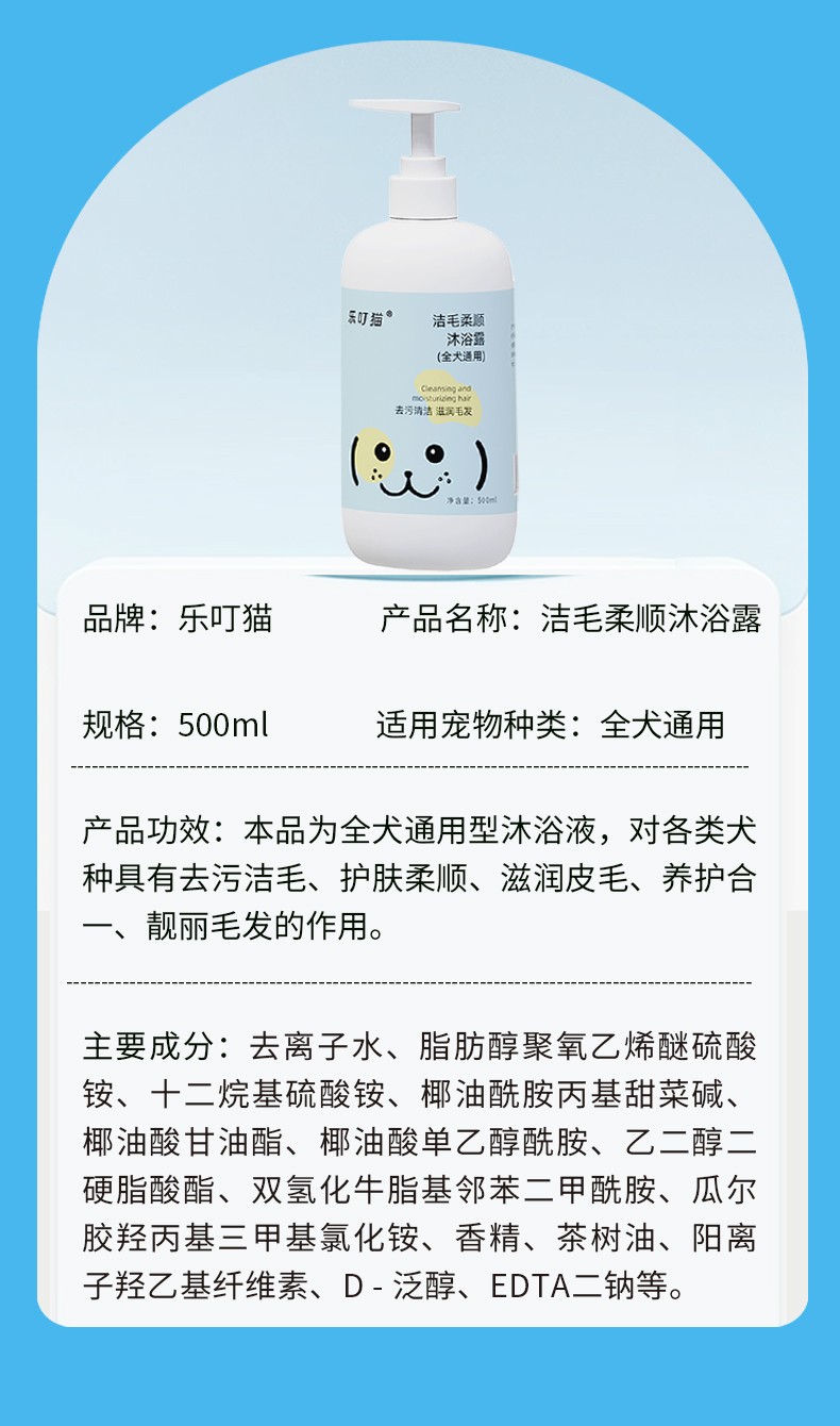 本品添加天然椰子油+茶树精油,深度清洁抑菌除味!对各类犬种具有去污洁毛、护肤柔顺、滋润皮毛、养护合一、靓丽毛发的作用。