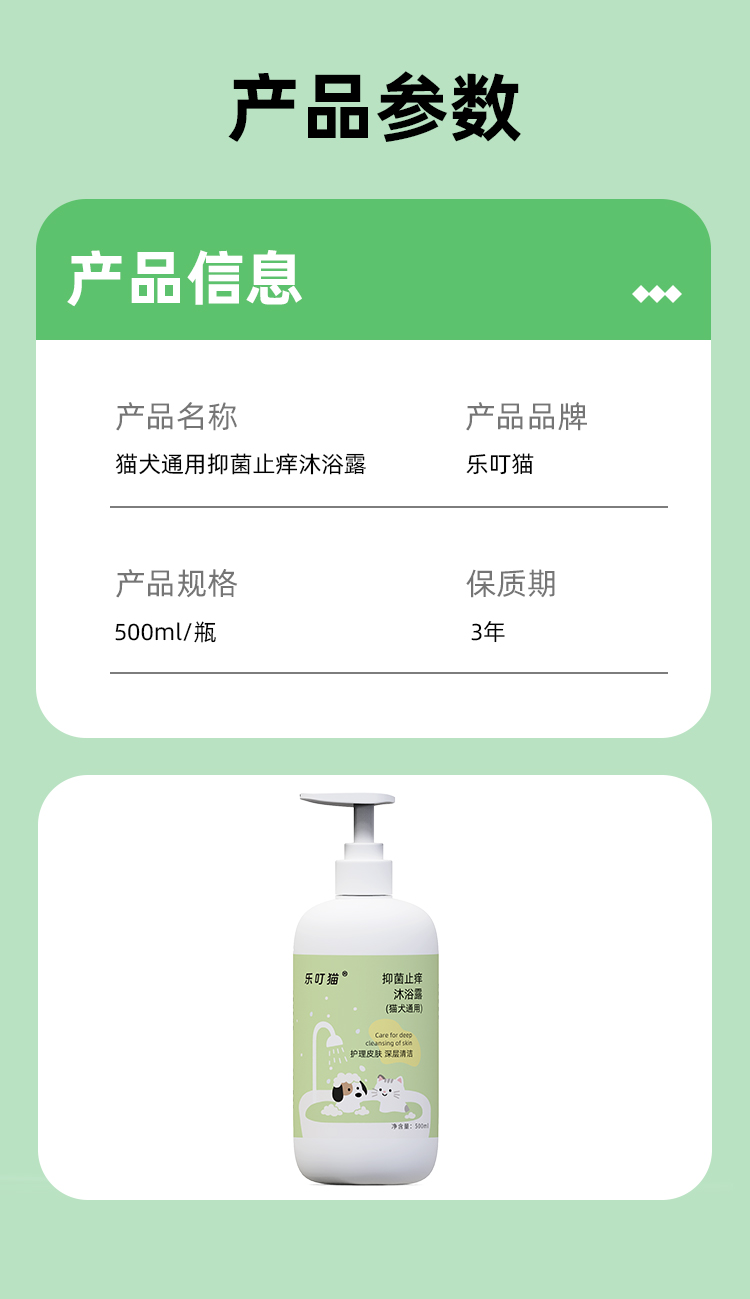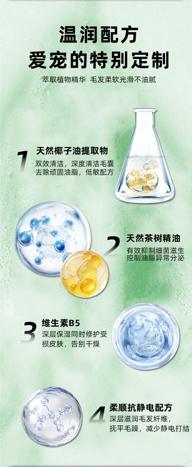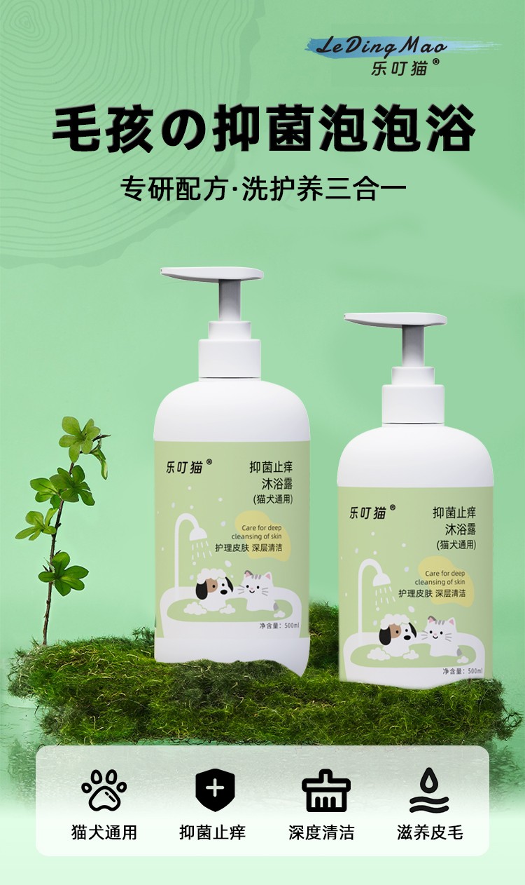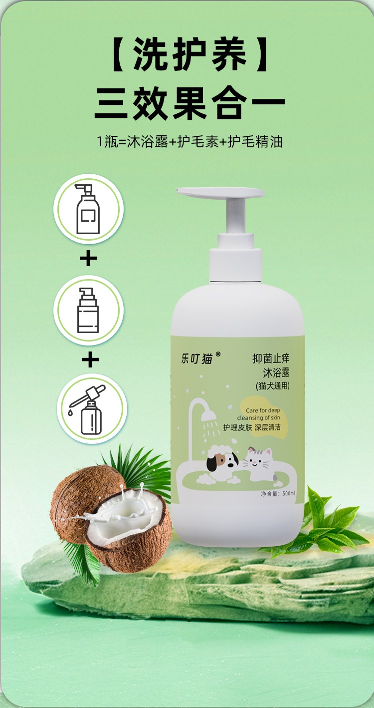 本品为猫犬通用沐浴露,含椰子油、绿茶、金银花等天然植萃成分。温和清洁,抑菌止痒!帮助宠物远离换季皮肤问题。