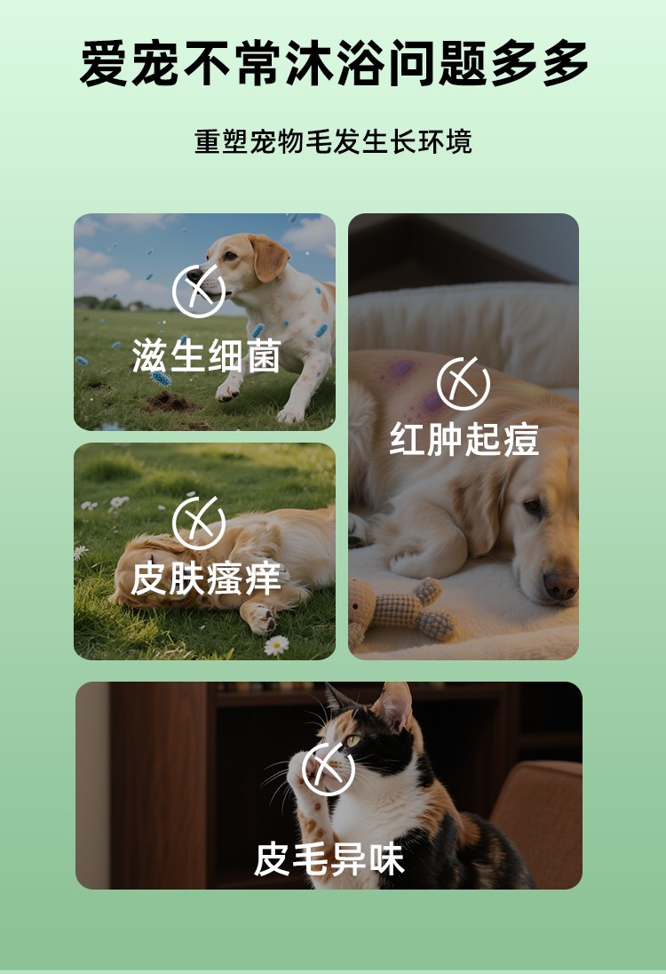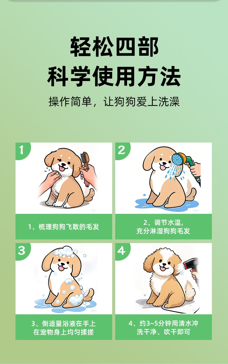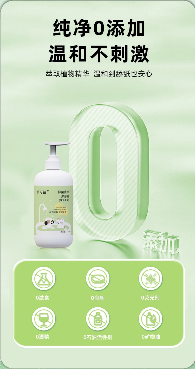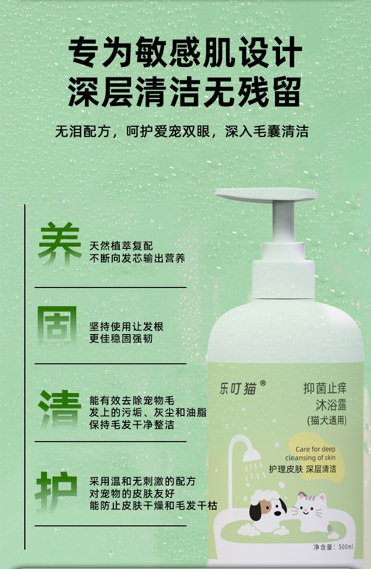 本品为猫犬通用沐浴露,含椰子油、绿茶、金银花等天然植萃成分。温和清洁,抑菌止痒!帮助宠物远离换季皮肤问题。