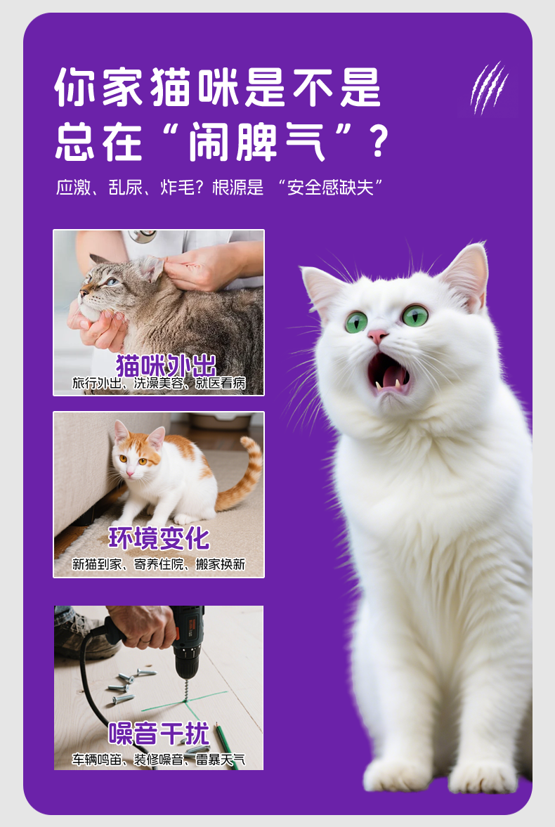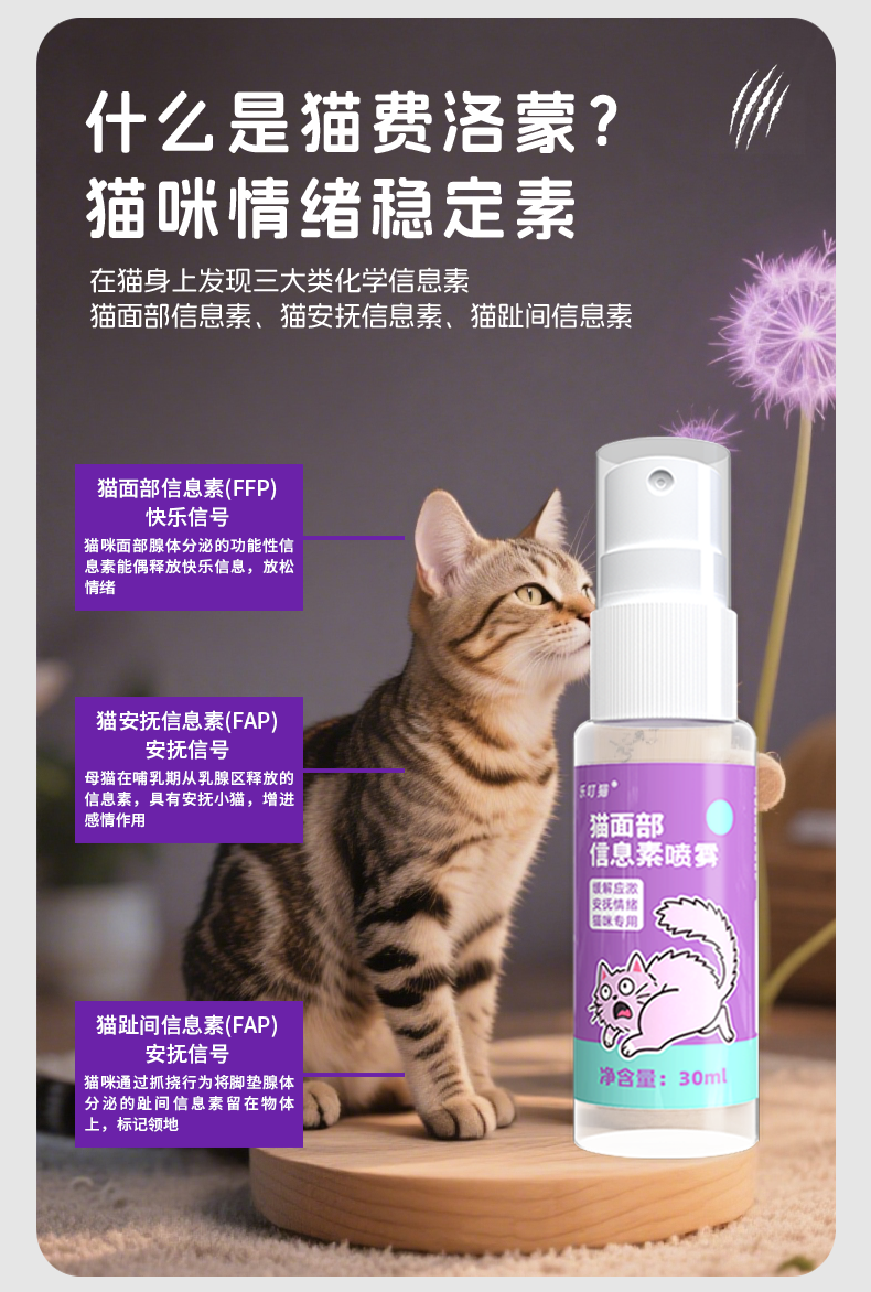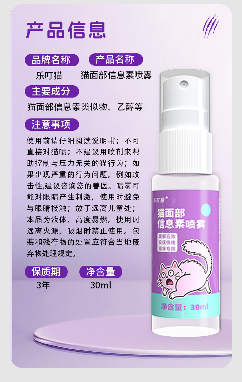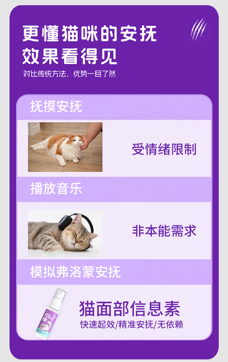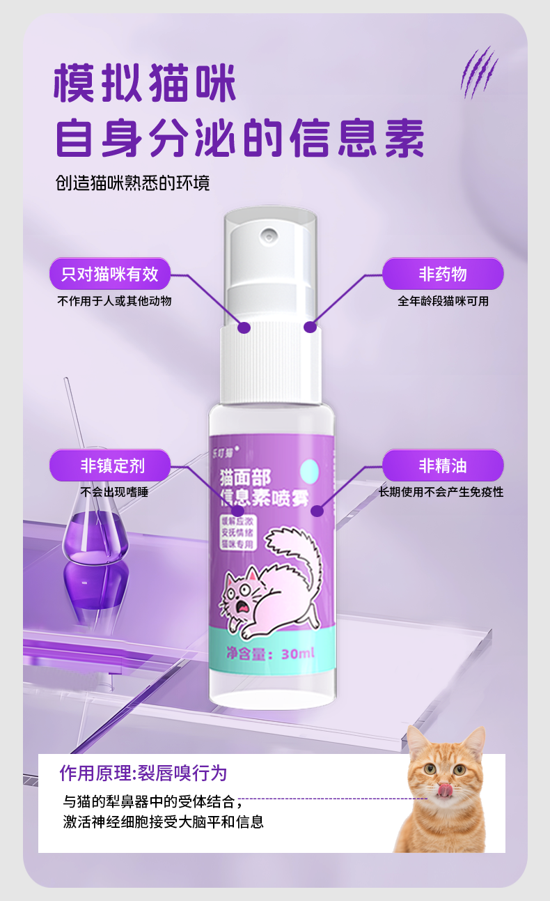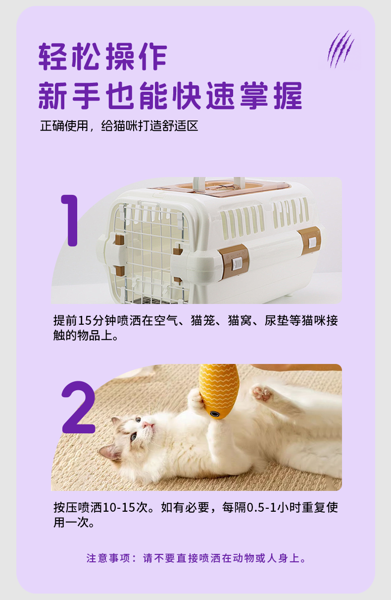 便镌小瓶喷雾设计,外出随身携带,缓解猫咪因环境变换而产生的应激反应,快速舒缓猫咪情绪不适。