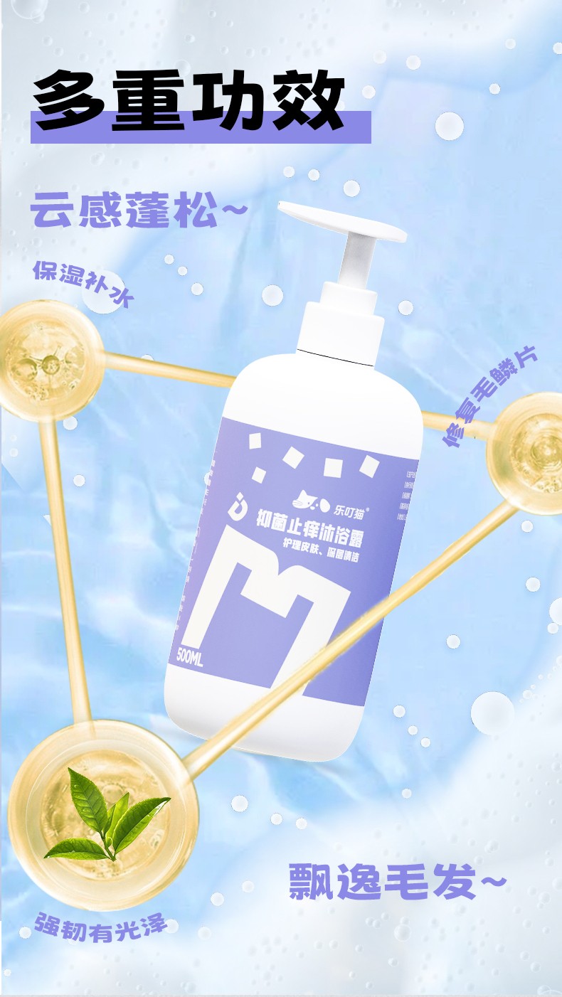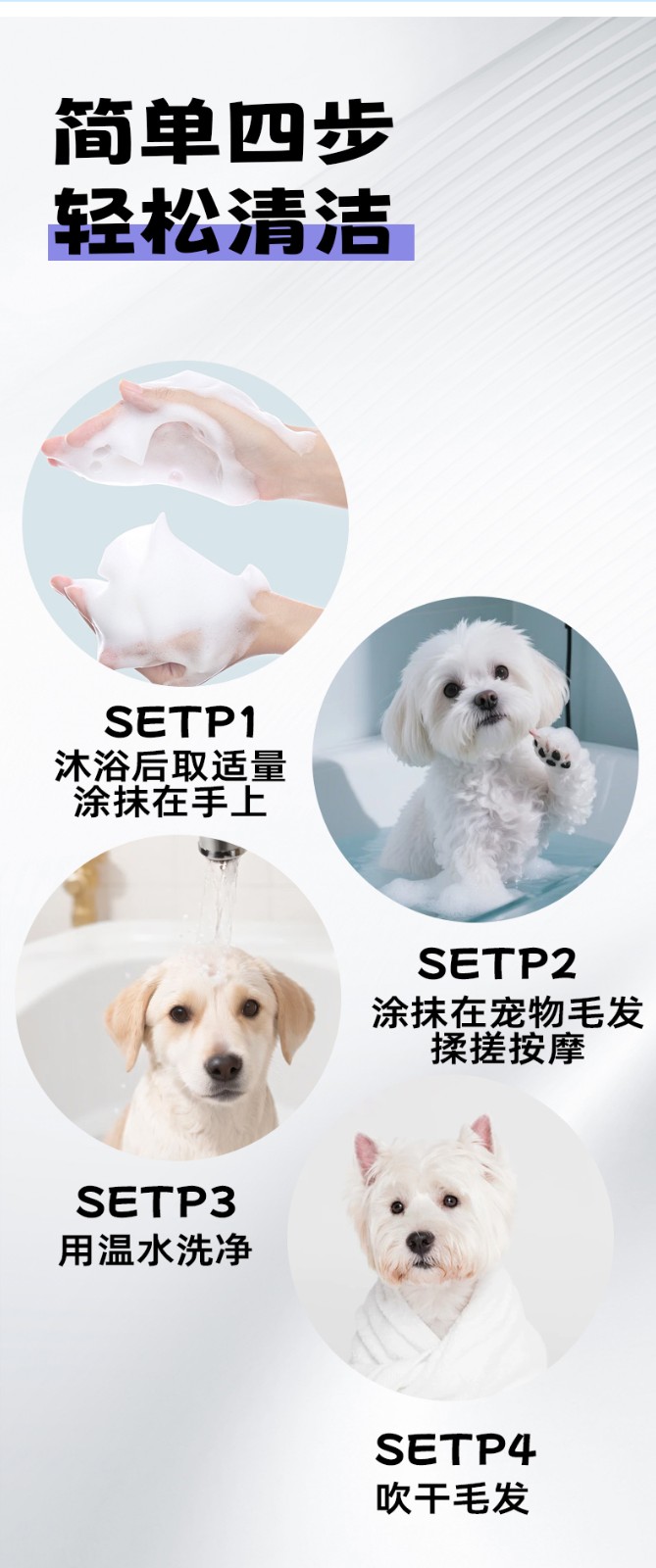 含绿茶提取物与金银花等天然成分,温和清洁、高效抑菌,舒缓止痒且滋润保湿,帮助宠物远离皮肤问题,享受清新舒适的每一天。