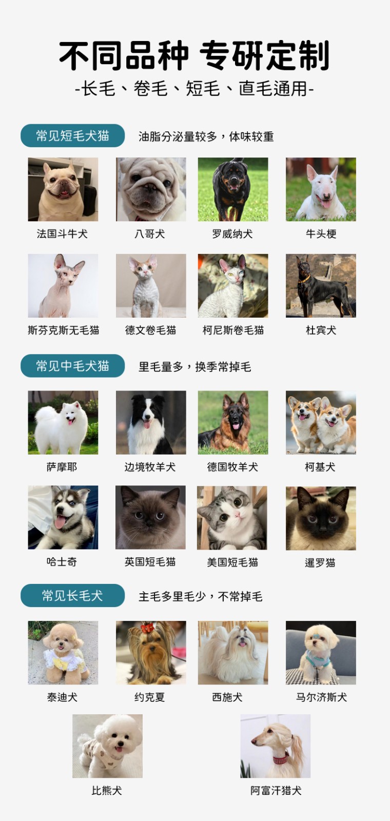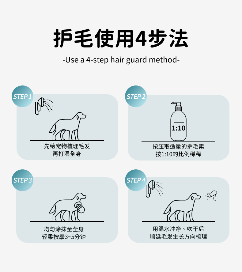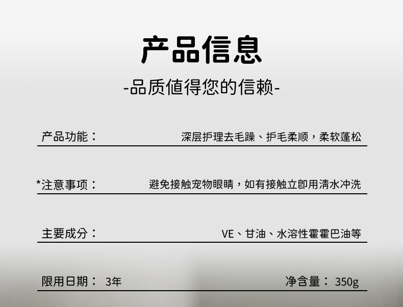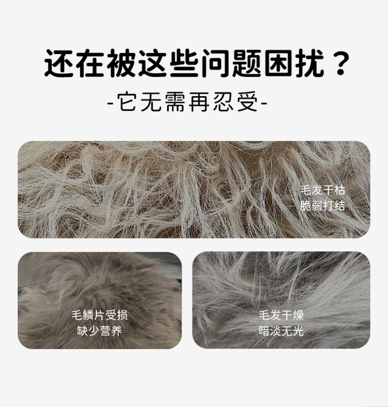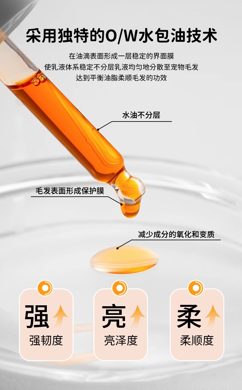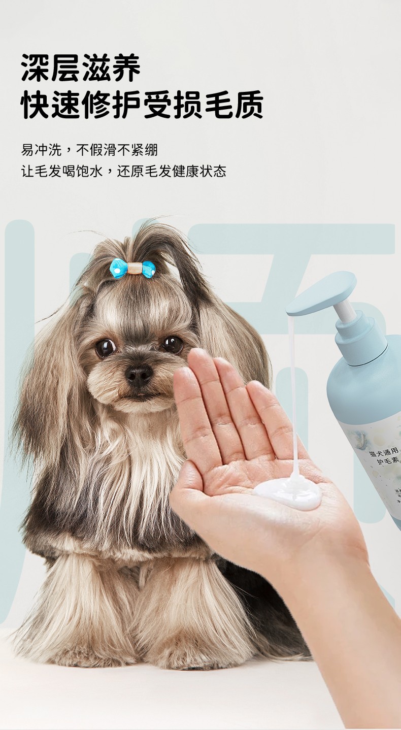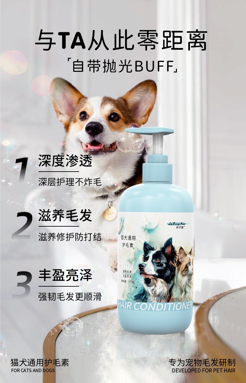本品为猫犬通用蓬松柔顺护毛素。具有滋养宠物毛发、减少打结、丰盈亮泽、靓丽毛发、提升质感、蓬松有型的作用。
