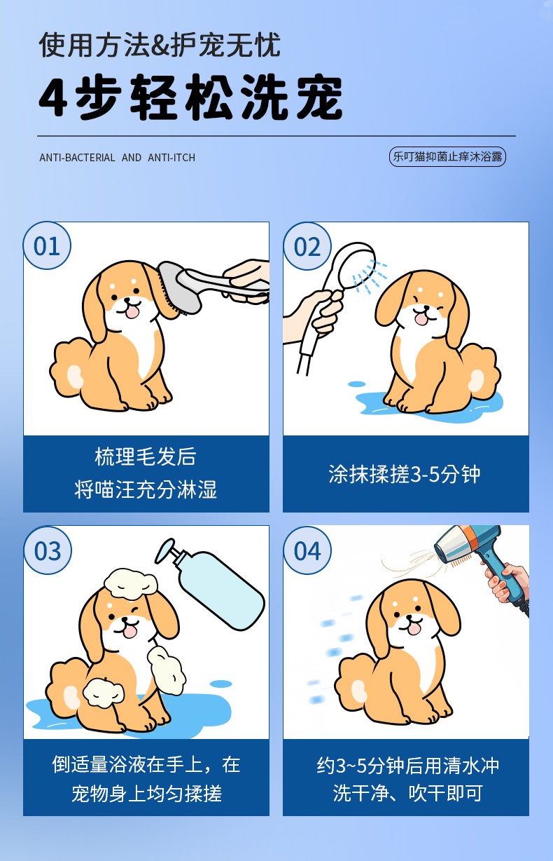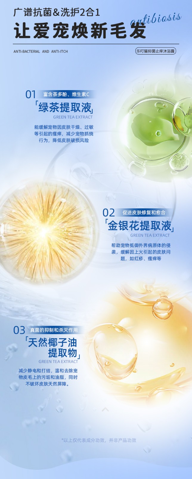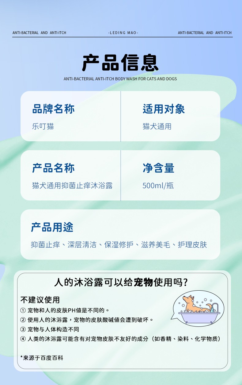 本品为猫犬通用型抑菌止痒沐浴液,对爱宠具有抑菌止痒、深层清洁、保湿修护、滋养美毛、护理皮肤等功效