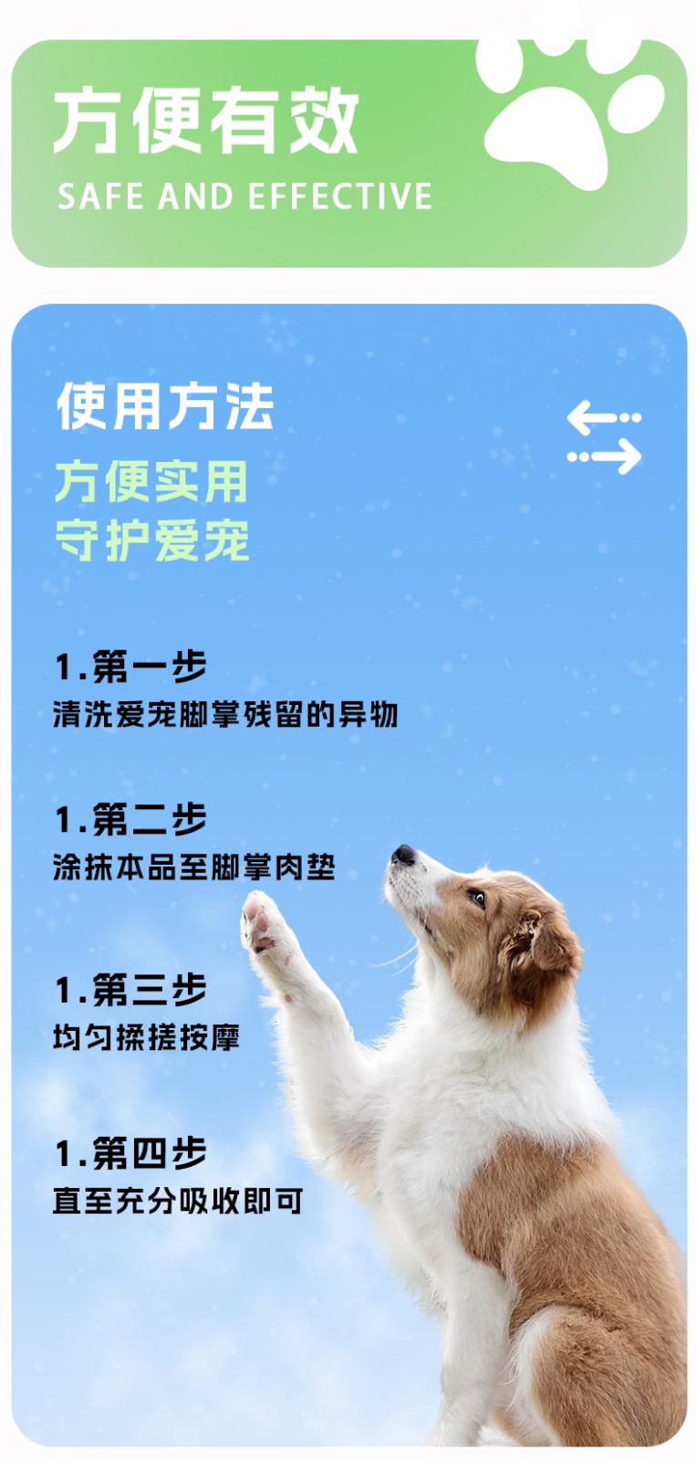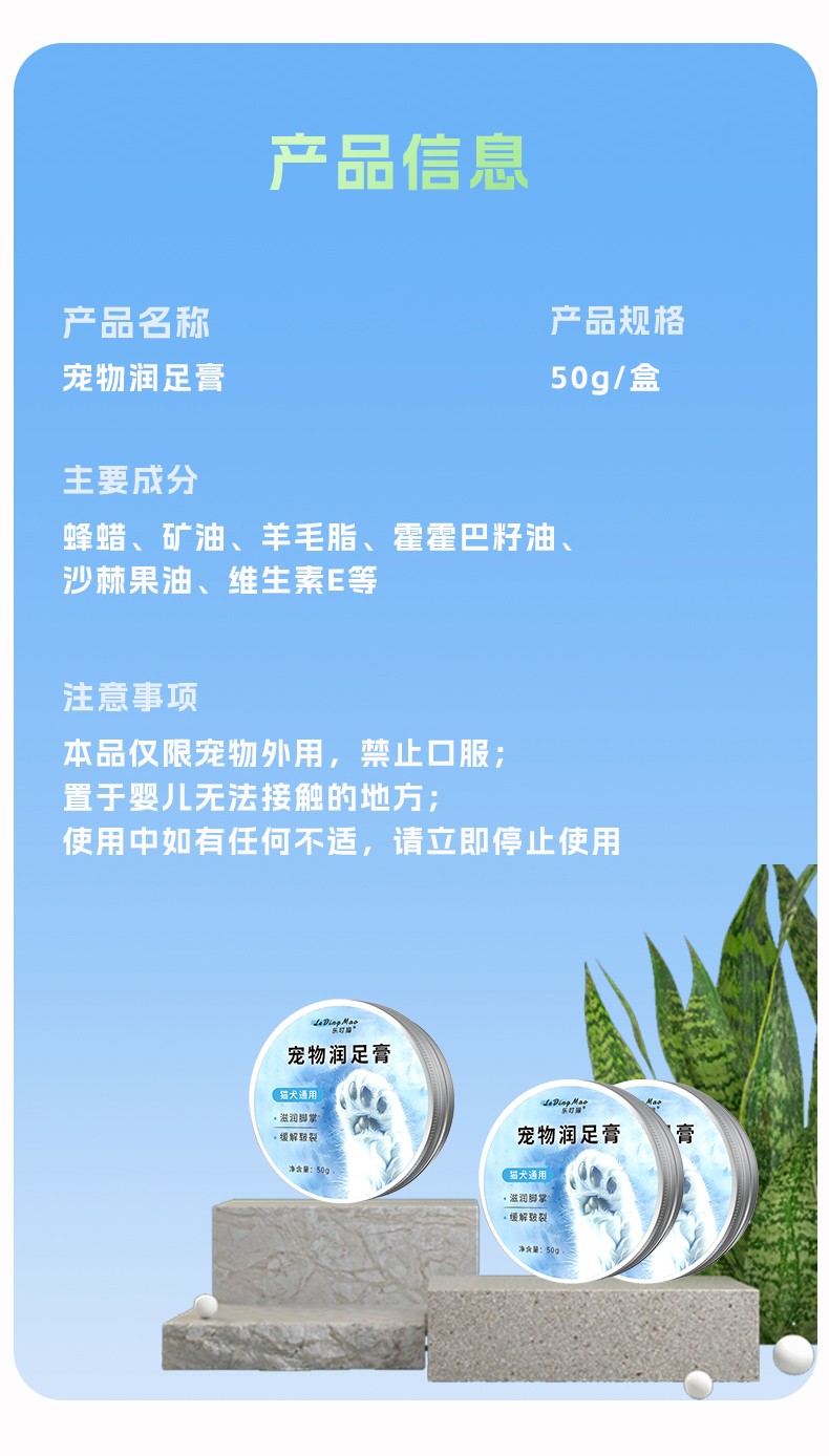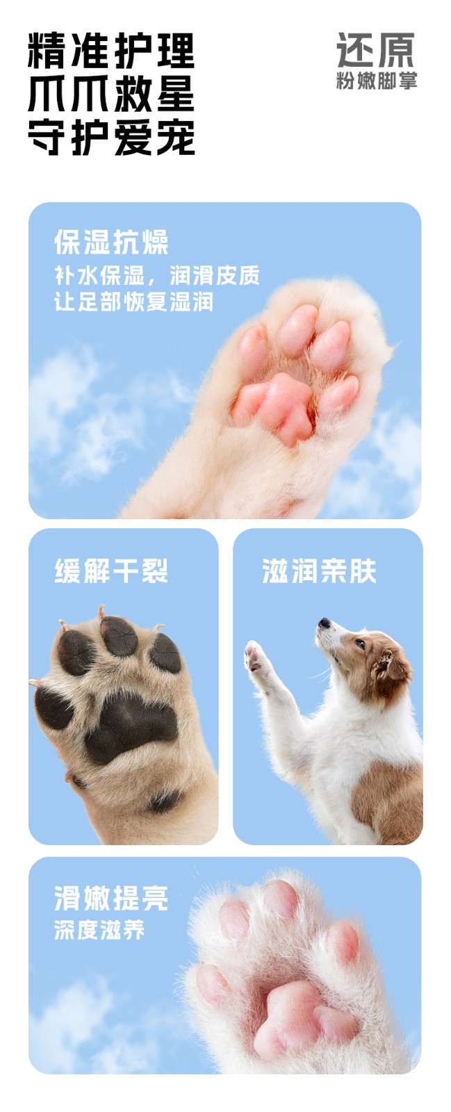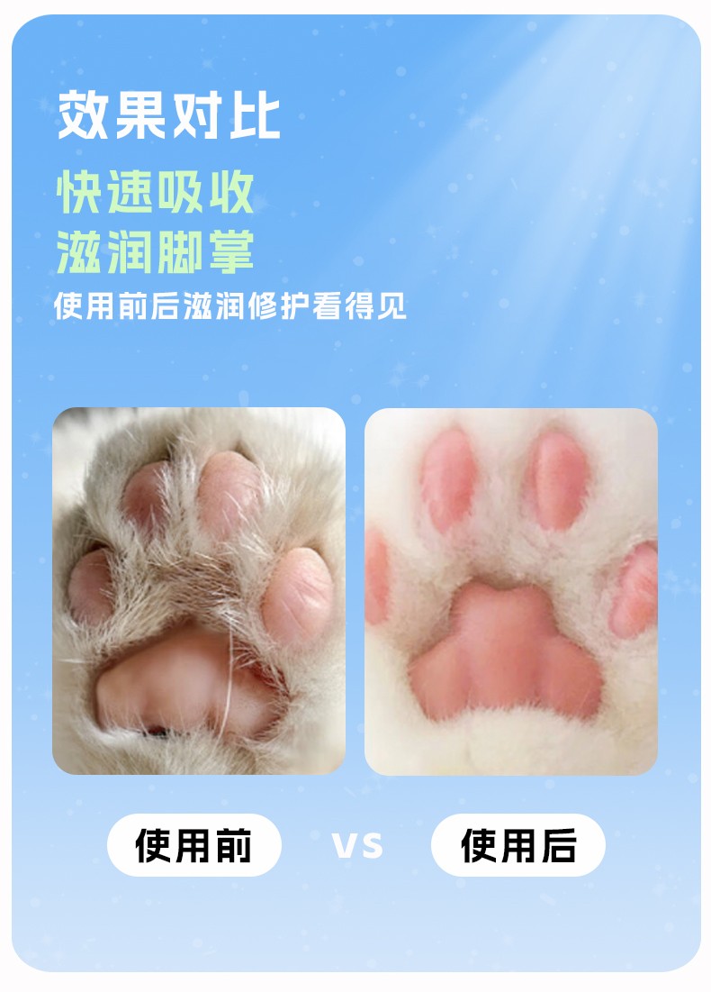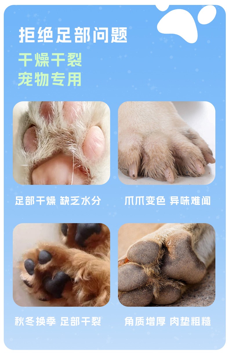 本品是针对宠物足底保养开发的润足产品。专门针对宠物皮肤研发,其中蕴含多种植萃精华,能够在宠物足底形成加厚保护膜,隔绝外界二次伤害,滋润受损脚掌,缓解宠物足底皲裂。