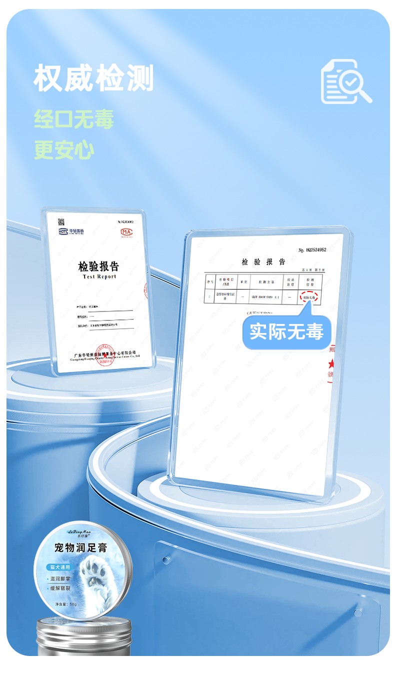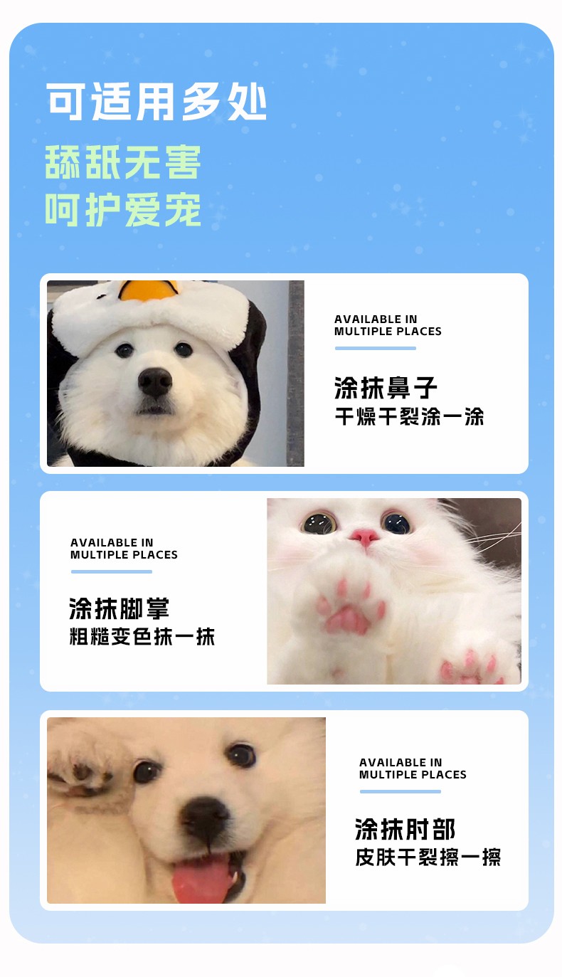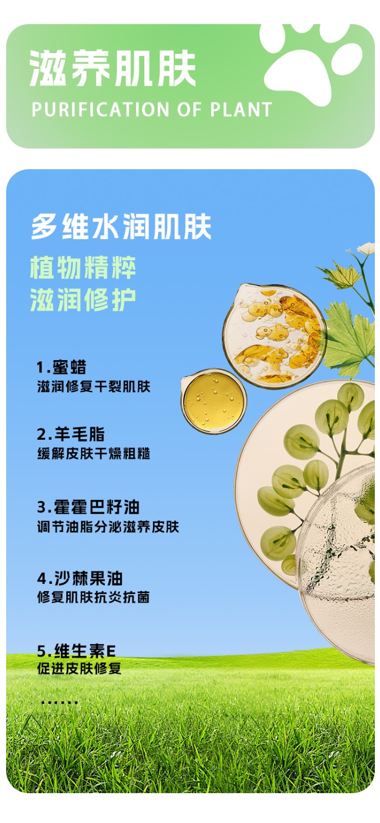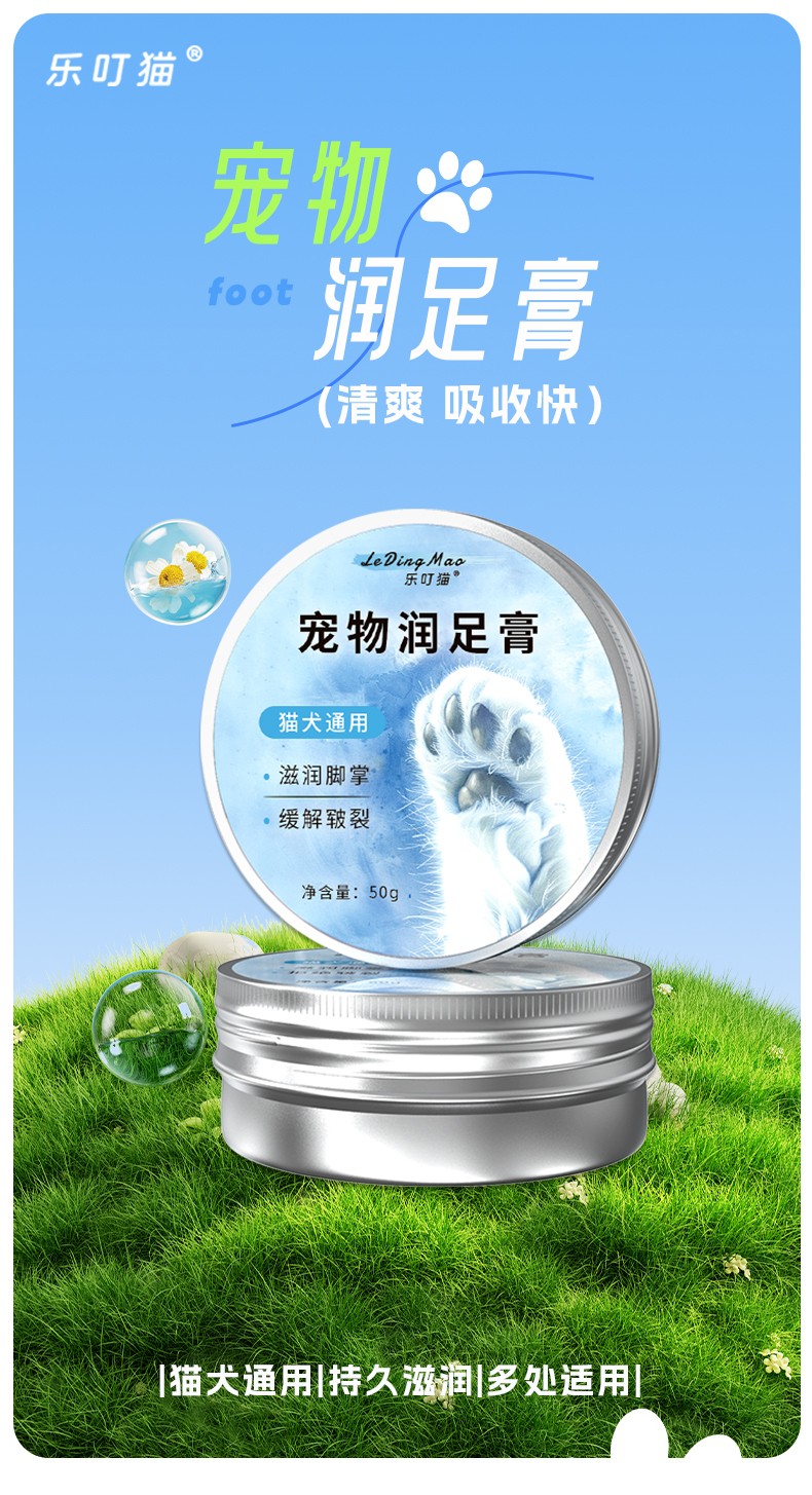 本品是针对宠物足底保养开发的润足产品。专门针对宠物皮肤研发,其中蕴含多种植萃精华,能够在宠物足底形成加厚保护膜,隔绝外界二次伤害,滋润受损脚掌,缓解宠物足底皲裂。