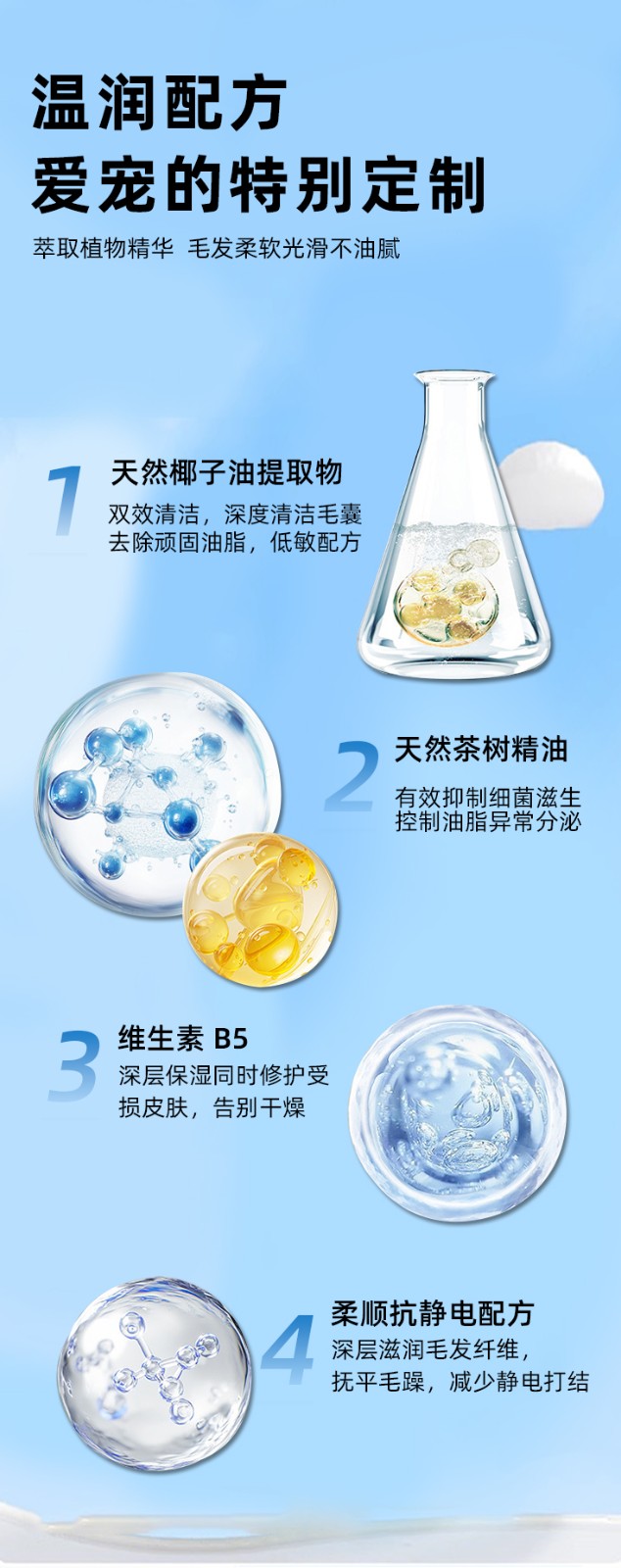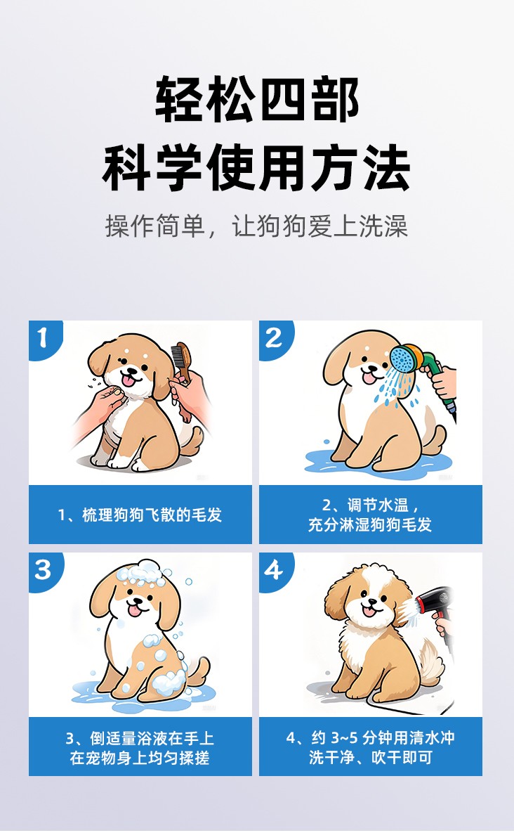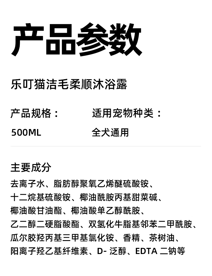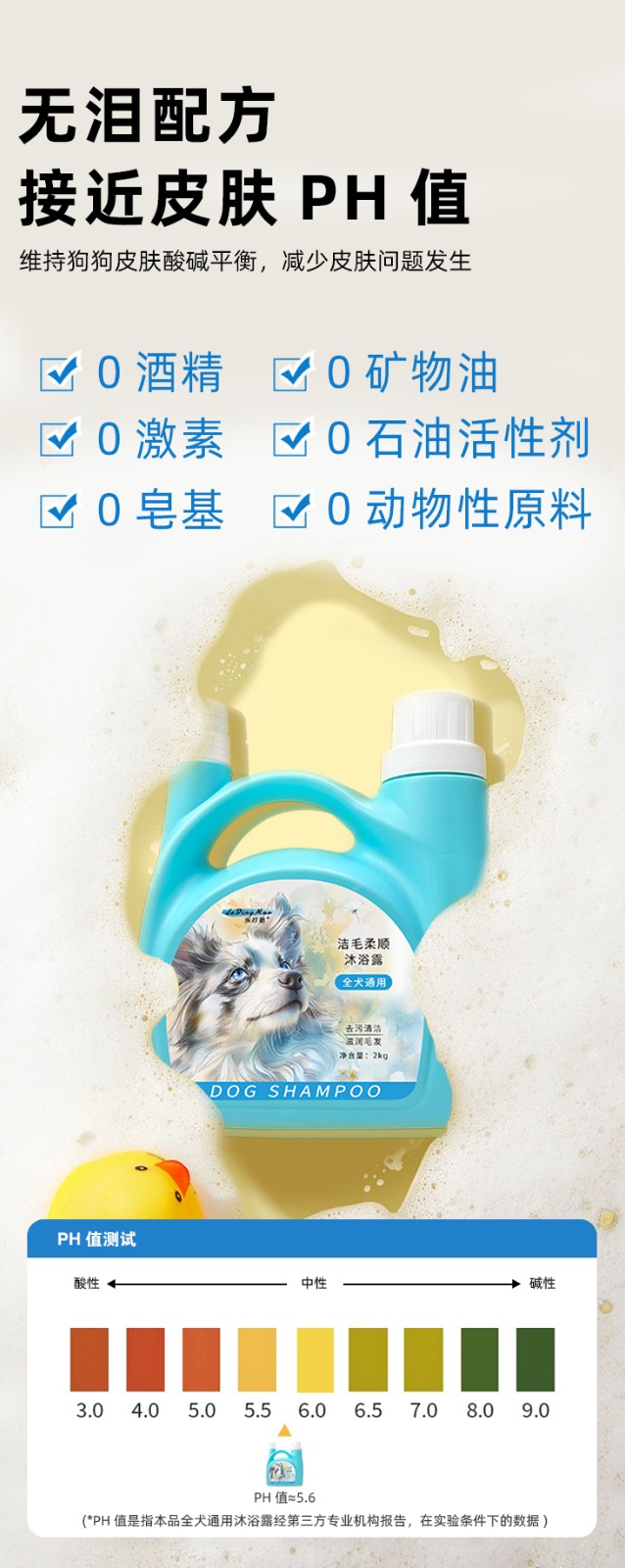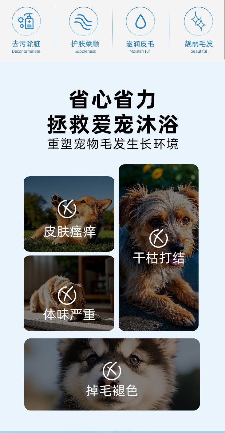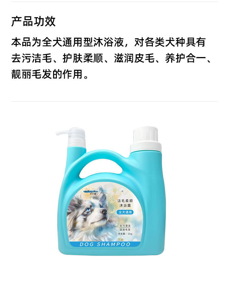 本品为全犬通用型沐浴液,对各类犬种具有去污洁毛、护肤柔顺、滋润皮毛、养护合一、靓丽毛发的作用。